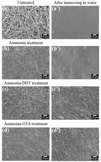 SEM images of electrospun collagen nanofibers before (left column) and after (right column) immersing in water for 1 day at 37 °C. Untreated (a,a’), ammonia treatment (b,b’), ammonia-DHT treatment (c,c’) and ammonia-GTA treatment (d,d’).