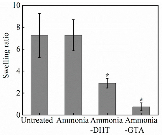 The swelling ratios of electrospun collagen tubes before and after various treatments are shown in Figure 7. Untreated collagen tube showed an extremely high swelling ratio. Even ammonia treatment did not reduce it. The swelling ratio generally reflects the degree of crosslinking [48]. It indicated that collagen tube as electrospun did not have enough crosslinks to resist to water invasion. Moreover, ammonia treatment did not promote the formation of crosslinking but only the recovery of collagen triple helix structure. It is consistent with the poor morphological stability of ammonia treated collagen tube. In contrast, swelling ratios of collagen tubes with crosslinking treatments decreased significantly. The formation of crosslinks contributed to build a water-insoluble network which suppressed the swelling. A special focus was given on the swelling ratio of collagen tube with ammonia-DHT treatment. Because of the limited crosslinks introduced by DHT treatment, the collagen tube absorbed twice as much water as its dry weight, which gave rise to the damage of collagen fiber structure shown in Figure 6c’.