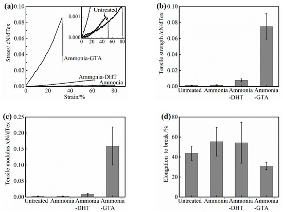 Mechanical properties are critical physical performances which should be adequate for withstanding any type of stress under physiologic conditions [49]. The typical stress-strain curves of electrospun collagen tubes in a wet state before and after various treatments are plotted in Figure 9a. The curve shape of untreated collagen tube showed a flat stress grow-up with increasing strain. The tensile behavior reflected the weaker and softer properties of untreated collagen tube. After ammonia treatment, the curve shape was similar to that of untreated collagen tube. However, the collagen tubes with ammonia-DHT treatment or ammonia-GTA treatment showed much steeper stress growing. The tensile strength, tensile modulus and elongation to break are determined from the stress-strain curves and plotted in Figure 9b–d, respectively.