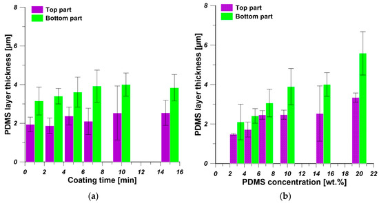 The thickness of PDMS selective layer: (a) the effect of coating time at constant concentration of PDMS solution equal to 15 wt%; (b) the effect of PDMS concentration at constant coating time equal to 10 min.