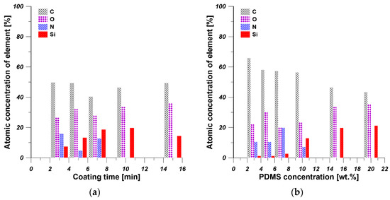 EDX surface mapping results for PDMS/PEI membranes fabricated (a) by changing the coating time, using PDMS concentration equal to 15 wt%; (b) by using various PDMS concentrations at constant coating time equal to 10 min.