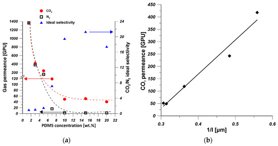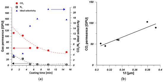To investigate the influence of coating time on the gas permeance, PDMS/PEI composite membranes were fabricated by immersing PEI supports in 15 wt% of PDMS solution at various time from 0.5 to 15 min and cured at 25 °C. Figure 5a shows the trends of CO2 and N2 permeances, and the ideal selectivity of PDMS/PEI membranes prepared at various coating times. It can be realized that the CO2 and N2 permeances decreased significantly when the coating time changed from 0.5 to 5 min. Then the CO2 permeance continued to decrease slightly, while the N2 permeance leveled off for the coating time in the range of 5 to 15 min. This is because the kinetic diameter of N2 molecule (0.36 nm) is larger than that of CO2 molecule (0.33 nm). Moreover, the CO2 molecules possess higher affinity to PDMS [50]. Hence, CO2 molecules are transported much faster than N2 ones, and they are more sensitive to the thickness change of PDMS layer (Figure 3a). On the other hand, the CO2/N2 ideal selectivity increased to the maximal values of 21, when the coating time approached 10 min. Afterwards, the CO2/N2 ideal selectivity decreased only slightly. This is caused by a fact that with an increase of coating time, the defect-free PDMS layer was formed, resulting in the increased value of the ideal selectivity. However, the coated PDMS might be re-dissolved in the solvent when a longer coating time is applied. As a result, defects might be formed and the selectivity was reduced. It is found that 10 min was the optimal coating time for the preparation of PDMS/PEI membranes with a high gas-separation performance. Similar results were also found by Chen et al. [35]. The thickness of PDMS layer of PDMS/PEI composite membrane prepared from 15 wt% of PDMS solution at various coating times was measured. Figure 5b shows the influence of PDMS layer thickness on CO2 permeance; it can be seen that CO2 permeance drops with the formation of thicker PDMS layer due to the increased mass transfer resistance [51,52]. According to the solution-diffusion model, the gas permeance is inversely proportional to the thickness of selective layer [53]. It can be seen in Figure 5b that the CO2 permeance is linearly proportional to the reciprocal of PDMS layer thickness, which revealed the hypothesis that the gas transport through the PDMS layer obeys the solution-diffusion mechanism.