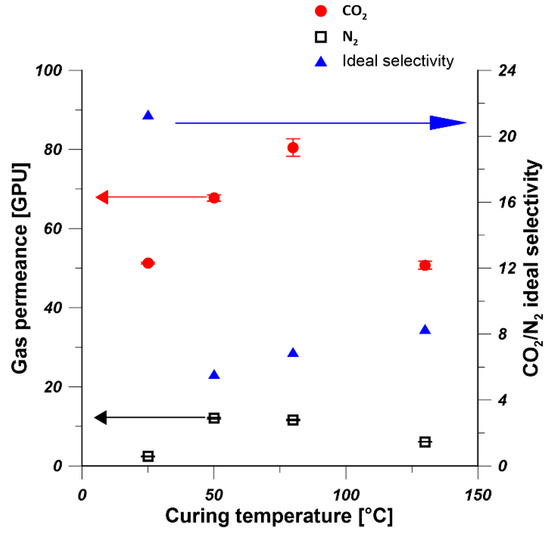 Effect of curing temperature on gas permeance and ideal selectivity of PDMS/PEI membranes (PDMS concentration—15 wt% and coating time—10 min).