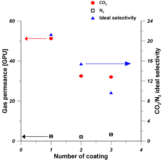 To investigate the influence of the multiple coating of PDMS layer on the gas permeance of PDMS/PEI membranes, one, two, and three PDMS layers were coated on the hollow-fiber substrate by using 15 wt% PDMS solution for 10 min at 25 °C. As it is shown in Figure 8, when the PDMS coating changed from one time to three times, the N2 permeance was practically constant, while the CO2 permeance decreased due to the increase in the thickness of PDMS layer from 3.3 to 5.5 µm. Therefore, CO2/N2 ideal selectivity decreased with the increase in the number of PDMS layers. Similar findings were presented in the work of Selyanchyn et al. [52]. They prepared Pebax/PDMS/porous support thin-film composite flat-sheet membranes, where a PDMS layer was used as a gutter layer and a Pebax layer was used as the selective layer. It was reported that when the thickness of Pebax and PDMS layer increased from 0.29 and 2.3 μm to 0.39 and 10.8 μm, respectively, the CO2 permeance and CO2/N2 selectivity decreased from 300 GPU and 43 to 180 GPU and 35, respectively. The decrease in gas permeance is owing to the increase of thickness of selective layer. The increased thickness of selective layer imparted more significant influence on CO2 permeance that it on N2, which resulted in the decrease in CO2/N2 selectivity. This is because larger gas molecules are preferentially transported through PDMS selective layer [55]. However, Kargari et al. [21] found that when the number of coating layers increased, the H2 permeance decreased, while the H2/CH4 selectivity increased. This is because the defect-free coating layer was developed as the number of coating layer increased, which finally led to a better performance.
