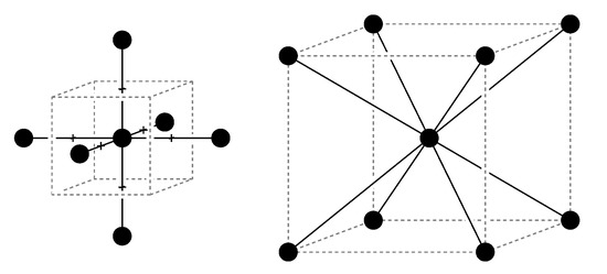 Unit cell of the six chain model (left) and eight chain model (right). The nodes represent reticulation points and the bold lines correspond to the polymer segments. These systems are labelled A.6 and A.8 in the following and correspond, respectively, to a simple cubic and to a body centered cubic lattice. All nodes are equivalent and connected to all their nearest neighbors.