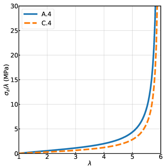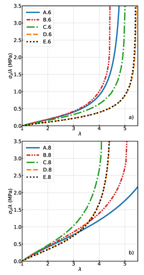 These results highlight the relevance of the “mean number of monomers” used in several micro-mechanical models [19,21,22]. Indeed, the addition of a distribution of monomers per chain does not have a strong impact on the stress modulus at low strain for the two models. However, in the literature, the main goal of this kind of analytical model is to produce a good approximation of experimental strain/stress curves valid up to high strain values [22]. With these results, we can easily understand one of the reasons why it is difficult to capture the experimental stress/strain behavior across the full strain range. It is the realisation that there is a “mean number of monomers” that will reproduce experimental data at low strain values, but a lower “mean number of monomers” will be required to describe the experimental behavior at high strain values.