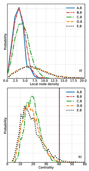 The probability distributions of the (a) local node density and (b) centrality of networks with a mean node connectivity equal to 8.