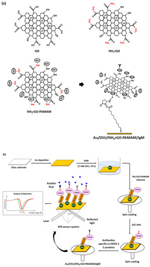 - Omar, N.A.S.; Fen, Y.W.; Abdullah, J.; Sadrolhosseini, A.R.; Mustapha Kamil, Y.; Fauzi, N.I.M.; Hashim, H.S.; Mahdi, M.A. Quantitative and selective surface plasmon resonance response based on a reduced graphene oxide–polyamidoamine nanocomposite for detection of dengue virus e-proteins. Nanomaterials 2020, 10, 569. [Google Scholar] [CrossRef] [PubMed]