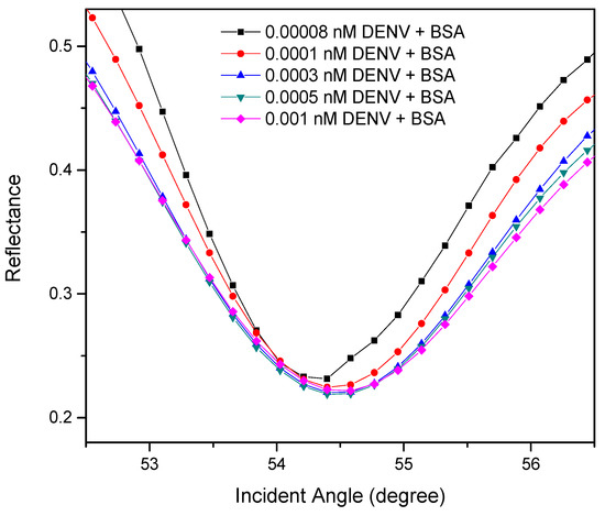 | Sample Concentration (pM) | Spike (%) | PBS + DENV-2 E-Protein Resonance Angle (Degree) | BSA + DENV-2 E-Protein Resonance Angle (Degree) | Recovery (%) |