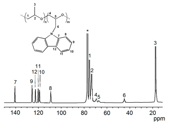 The synthesis of polymers with pendant carbazolyl groups has attracted great academic and industrial interest thanks to the unique spectroscopic properties that they exhibit [1,2,3,4,5,6,7]. Starting from polyvinylcarbazole (PVK) [8], different kinds of polymers with pendant carbazolyl groups, i.e., polyacrylate [9,10], polymethacrylate [11,12,13,14], polystyrene [15,16,17], and polyolefin [18,19,20,21] derivates, have been reported. Poly(9-(2,3-epoxypropyl) carbazole) (PEPK) has been widely studied because of its high carrier and hole drift mobility, too [22,23,24,25,26]. As regards photoconductive properties of PEPK, they are similar or superior than those of PVK [1]. In recent years, block copolymers presenting polymeric blocks containing pendant carbazolyl groups have also gained much attention because of their potential ability to form ordered structures through self-assembly processes, which makes them promising materials for applications in optoelectronics. For example, they could be employed as light-emitting or organic photo-refractive materials. By tuning the chemical nature and length of each block, block copolymers with peculiar chemical, physical and optoelectronic properties can be suitably obtained. To this aim, controlled polymerization techniques, i.e., controlled radical or living anionic methods, have to be employed. A variety of research papers describe the synthesis of carbazole-containing block copolymers using controlled radical polymerization [27,28,29]. By living anionic polymerization, block copolymers based on olefin monomers containing carbazole groups were also obtained [30]. In this paper, the synthesis and characterization of di-block copolymers polypropylene oxide (PPO) and PEPK are reported. PPO-b-PEPK copolymer samples (see Figure 1) were synthesized in one pot via sequential monomer (propylene oxide (PO) and 9-(2,3-epoxypropyl) carbazole (EPK)) addition by using i-PrONa and i-Bu3Al as initiating system. It is worth noting that PO anionic polymerization initiated by alkali metal alkoxides mainly produces oligomeric species, some of which exhibit terminal allyl unsaturations [31,32,33].