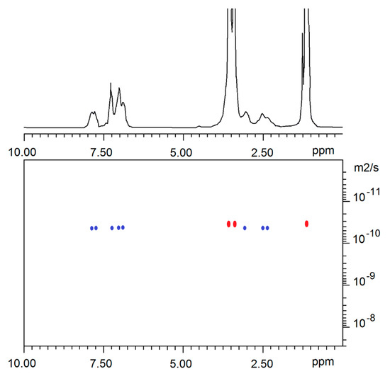 PPO-b-PEPK copolymer microstructures were evaluated by 1H and 13C NMR analyses. As an example, the 1H and 13C NMR spectra of sample 2 of Table 1 are shown in Figure 2 and Figure 3, respectively. In particular, the characteristic signals of both PO and EPK regioregular sequence units were recognized and assigned in both spectra. Unfortunately, in both spectra, diagnostic signals, proving the effective formation of PPO-b-PEPK copolymer rather than the presence of PPO and PEPK homopolymers, are not detectable. In order to demonstrate the successful sequential polymerization of PO and EPK monomers, a DOSY NMR experiment was set up. In detail, a DOSY NMR experiment of sample 2 was achieved in dilute CDCl3. The DOSY map with the related 1H NMR spectrum projected on top is reported in Figure 4. The 1H NMR spectrum exhibits signals related to both PPO (δ = 3.56, 3.41, 1.15 ppm) and PEPK (δ = 7.89 ‒ 6.89 (aromatic), 3.05, 2.52, 2.42 ppm) blocks. As shown on the DOSY map, 1H NMR signals of PPO and PEPK present the same diffusion coefficient—3.99 × 10−11 m2 s−1, which is consistent with an efficient sequential polymerization. Moreover, to prove that PPO growing chains totally reacted with EPK monomer and no residual PPO homopolymer was present in sample 2, a dilute CDCl3 solution of sample 1 (PPO homopolymer) of Table 1 was analyzed by DOSY NMR and compared to sample 2 (PPO-b-PEPK block copolymer) spectrum. The diffusion coefficient of sample 1 was found to be 1.70 × 10−9 m2 s−1, different from the one of sample 2, thus proving that no unreacted PPO homopolymer is present and that the formation of the copolymer was successful.