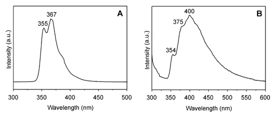 The fluorescence spectrum of a THF solution of PPO-b-PEPK copolymer (sample 2, Table 1), measured under an excitation wavelength of 290 nm at room temperature, is reported in Figure 8A. Only two bands in the high energy region presenting maxima at 355 and 367 nm were detected. Differently, the fluorescence spectrum of PPO-b-PEPK copolymer sample 2 film, in the solid state, presents a broad band at 400 nm with two shoulders at 354 and 375 nm (see Figure 8B). As expected, both spectra are very similar to those expected for the PEPK homopolymer. It is worth recalling that the optical properties of EPK homopolymers and oligomers [38,39], as well as other polymers containing carbazole pendant groups, have been already deeply investigated [2,3,4,5,20]. It is well known the peculiarity of the photophysical behavior of this class of polymers is able, in some cases, to show excimer fluorescence [40,41,42,43]. In particular, it was reported that polymers with pendant carbazolyl groups do not exhibit excimer emissions in diluted solutions at room temperature, except when the carbazole chromophores are directly bound to the polymer backbone as in the case of PVK [1,40,41,42,43]. On the contrary, in the solid state, carbazole-containing polymers also present a short spacer between the polymer chain and the carbazole groups give rise to excimer fluorescence [1,2,15,18,19,20,21,40,41,42,43]. Moreover, it was reported that, depending on polymer chain conformation, two different excimer fluorescences can be generated: the low energy ‘‘sandwich like” excimer and/or the high energy ‘‘partially overlapping” excimer fluorescence (see Scheme 3) [2,15,18,19,20,21,40,41,42,43].