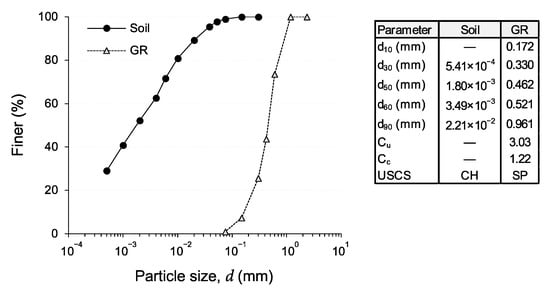 Referring to Figure 1, which illustrates the particle-size distribution (PSD) curves for the test materials; the test soil contained 1% fine sand (0.075–0.425 mm), 47% silt (2–75 μm) and 52% clay (<2 μm), dry mass basis as per ASTM D422 []. In terms of consistency, the fall-cone liquid limit (LL)—tested by means of a standard 80 g–30° fall-cone device in accordance with AS 1289.3.9.1 []—and the rolling-thread plastic limit (PL)—tested in accordance with AS 1289.3.2.1 []—were measured as LL = 84.3% and PL = 32.0% (mean value calculated based on three measurements, conducted by a single operator, with a standard deviation of 2.3%), thereby producing a plasticity index value of PI = LL − PL = 52.3%, as per AS 1289.3.3.1 []. Following the Unified Soil Classification System (USCS) outlined in ASTM D2487 [], the test soil can be classified as clay with high plasticity (CH). Furthermore, the specific gravity of the soil solids was measured as = 2.73 (ASTM D854 []). In terms of compactability, the optimum moisture content (OMC) and maximum dry unit weight (MDUW)—tested under the standard Proctor energy (SPE) level (ASTM D698 [])—were measured as wopt = 28.0% and γdmax = 14.6 kN/m3, respectively; the latter is equivalent to a relatively high void ratio of e = 0.834.