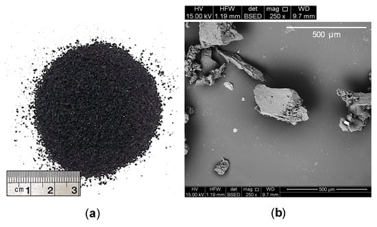 The scanning electron microscopy (SEM) technique was employed to observe the GR material’s morphological features (see Figure 2b). From visual inspection, the GR particles can be characterized as non-spherical and somewhat angular in shape, with occasional cavities and micro-cracks distributed along their surfaces, hence showcasing a rough surface texture [,]. Furthermore, as stated in the manufacturer’s literature, the GR material possessed a specific gravity of = 1.09 (i.e., 2.5-fold lower than that of the test soil with = 2.73), a specific surface area of 0.05 m2/g, and a softening point of 170 °C. In terms of average chemical composition, the GR material consisted of 55% styrene–butadiene copolymer, 25–35% carbon black, 5–20% acetone extract, 2–3% zinc oxide and 1–3% sulfur, mass basis.