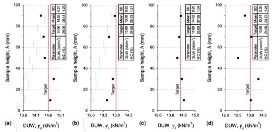To ensure that the compacted samples were uniform in fabric (i.e., blending homogeneity) and hence repeatable in behavior, on completion of static compaction, the variations of both the DUW and MC parameters were measured along the height of representative samples, namely, R0S0T0, R10S0T0, R0S15T0 and R10S15T0. As per common practice [,,], this was achieved by slicing each of the aforementioned compacted samples into five equal-height segments and testing each segment for DUW and MC, as illustrated in Figure 4. The variations of both the DUW and MC parameters were found to be marginal, as supported by the low standard deviation (SD) values (e.g., 0.2 kN/m3 ≤ SD ≤ 0.3 kN/m3 for DUW), thus confirming the suitability and repeatability of the employed sample preparation technique (in terms of mixing and compaction).