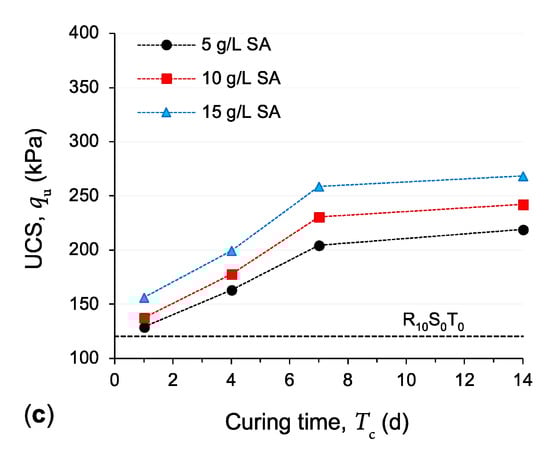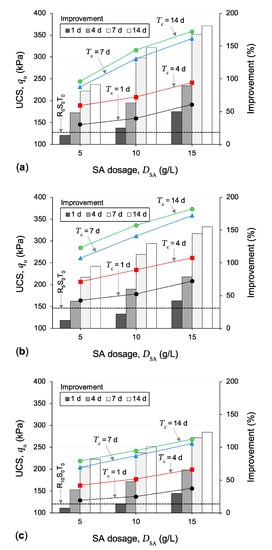 Variations of the UCS parameter against SA dosage for the samples (a) R0SyTz, (b) R5SyTz and (c) R10SyTz, where y = {5, 10, 15} and z = {1, 4, 7, 14}.