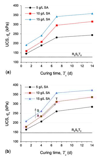 - Further, for any given GR content and SA dosage, the mobilized UCS was found to follow an exponentially increasing trend with an increasing curing duration; beyond seven days of curing, however, the positive effects of curing became less pronounced and, in most cases, rather marginal. Interestingly, the overall positive contribution to the UCS parameter provided by increasing the SA dosage (for the investigated SA dosage range) was found to be somewhat less prominent compared with that offered by extending the curing duration (particularly for Tc < 7 d).