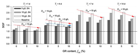 Figure 7 illustrates the variations of the SGF parameter—that is, the UCS ratio of an SA-treated sample to its non-treated counterpart, as defined in Equation (5)—against GR content for the tested samples. As is evident from this figure, for any given SA dosage and curing duration, an increase in GR content was accompanied by a somewhat notable reduction in the SGF parameter, particularly for fGR = 10%—for further reference, follow the three trendlines labeled as “DSA = 5 g/L, DSA = 10 g/L and DSA = 15 g/L” for Tc = 4 d. For instance, the samples R0S10T4, R5S10T4 and R10S10T4 produced SGF values of 1.63, 1.60 and 1.47, respectively. Moreover, the rate of reduction in the SGF parameter (with respect to GR content) was found to be more pronounced for higher SA dosages and/or longer curing durations—for instance, compare the three trendlines labeled as “DSA = 15 g/L” for Tc = 1, 4, 7 and 14 d; these trendlines produced reduction rates (i.e., trendline slopes) of ΔSGF/ΔfGR = −0.10, −0.12, −0.27 and −0.29, respectively.