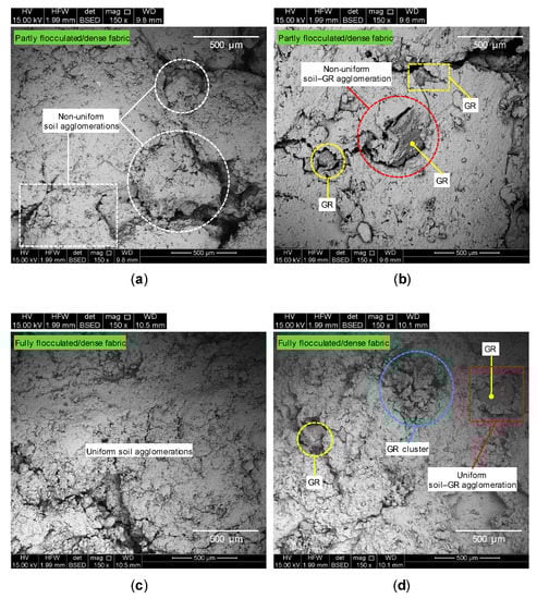 It should be mentioned that the original (or as-compacted) shape and extent of the inter- and intra-assemblage pore-spaces may have changed during the SEM specimen fabrication process (see Section 3.3), owing to sample fracturing and, more importantly, the development of tensile stresses (and hence micro-cracks) within the soil fabric during the fourteen-day desiccation process []. However, given that the SEM specimen fabrication process for all of the investigated mix designs was identical in terms of drying conditions (e.g., temperature, humidity and duration), the SEM micrographs presented in Figure 8, which are essentially relative in nature, still provide a rather reliable basis for the comparison of the four different mix designs. Additional tests employing the environmental SEM technique, which enables wet specimens to be observed through the use of partial water vapor pressure in the microscope specimen chamber, should be performed to further improve upon the authors’ postulated microstructure analysis.