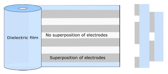 The main advantage of multisection metallized capacitors comes from lowering the inductance and resistance values of the winding []. Figure 2 shows the configuration of the longitudinal multisection metallized capacitor and the arrangement of the metallization on the dielectric film. Furthermore, to manufacture the connections of multisection metallized capacitors, tabs are inserted in the center of the capacitors and on the outer edge in order to contact the first and last sections of the winding [].