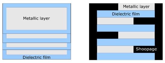 Stacked-film metallized capacitors consist of a stack of elementary capacitors connected in parallel []. This particular assembly is suitable for applications requiring good compaction. The manufacturing technique that uses stacked film capacitors (Figure 3) is the same as that using wound capacitors (Figure 4), however in the case of metallized capacitors, two insulating films with metallization (aluminum layer 20 to 30 nm thick) are used, whereas with wound capacitors, and as shown in Figure 4, the film–metallized electrode assembly is wound on a wheel (winder) measuring about 80 cm in diameter []. Figure 3 and Figure 4 respectively show the configuration of stacked metallized and metallized capacitor coils. They present the metallized layers, the dielectric film and the location where the electrical connections are created (shoopage).