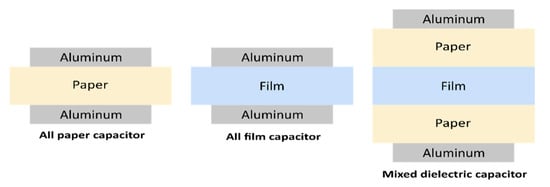 Film capacitors are manufactured in the form of a winding using a capacitor winding machine, or in the form of a stack of dielectric films. These two manufacturing technologies are also respectively known as coil technology and the stacking technique [,]. Four different types of film capacitors can be found in both technologies, namely mixed capacitors, all-paper capacitors, all-film capacitors and metallized film capacitors []. Furthermore, depending on the choice of electrodes used, capacitors can take on two forms: dielectric armature capacitors and metallized capacitors. Usually, armature capacitors are used for very high-current applications, while metallized film capacitors are used for low-current applications.