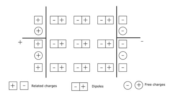 There are four types of polarization that can be observed in polymeric materials: electronic, atomic, orientation and interfacial. As for the types of charges on the capacitor electrodes, they can be either free charges related to maintenance of the vacuum voltage or fixed charges, which are required to compensate for the phenomenon of polarization. Figure 7 presents this phenomenon in a dielectric material. It shows the free charges (negative and positive charges) on the terminals of the electrodes, as well as related charges (dipoles).