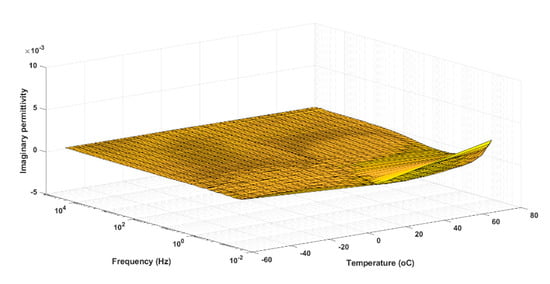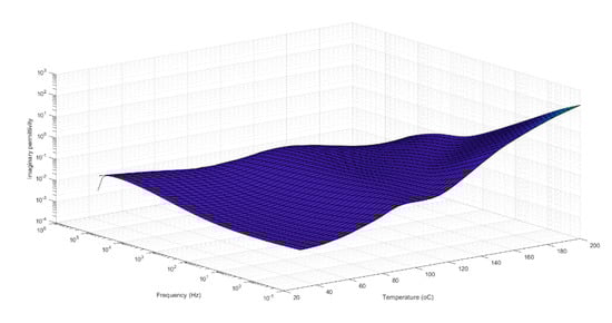 Figure 8 and Figure 9 respectively show the responses of the dielectric losses of a typical polar polymer (PET) and of a non-polar polymer (PE). On the one hand, in Figure 8, local maxima associated with the α and β relaxation mechanisms can be observed. These peaks are due to the movements of the main and side chains or rotational movements of groups of the polymer. In Figure 8, the α relaxation mechanism is illustrated between frequencies from 1 to 10 (Hz) at temperatures ranging from 80 to 140 °C, and the presence of the β relaxation mechanism is manifested at high frequency. On the other hand, only the DC conductivity can be observed in the relaxation spectra of polyethylene at high temperature and low frequencies (the conduction phenomenon is manifested in Figure 8 and Figure 9 by an increase in dielectric losses when the frequency decreases).