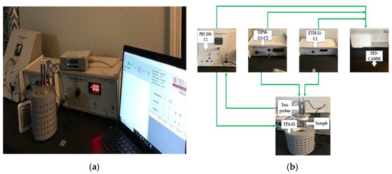 TPX-200 C is a well-known and commonly used two-probe fixture of the high resistivity samples for the resistivity measurement, which is beyond the range of the four-probe method. The experimental setup includes: (1) A two-probe arrangement, e.g., TPA-01 containing two spring-load contact probes insulated with Teflon, able to move in a pipe, mounted in a stand, sample plate, and RTD sensor; (2) a PID controlled oven (PID-200-C1); (3) a digital Pico ammeter (DPM—111-C2) with the minimum current measurement of 1012 A; (4) a high voltage power supply with a maximum of 1500 V output (EHT-11-C1); and (5) a computer interface (SES-CAMM) for data acquisition (current, temperature, and voltage) [51]. Figure 1 illustrates the overall setup of the TPX-200 C and the connection block diagram of the setup components.