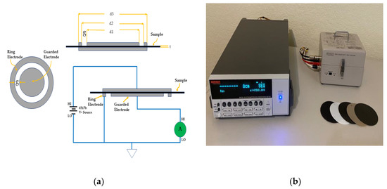 where g is the distance between the guarded electrode and the ring electrode, and d1 is the diameter of the guarded electrode. Finally, having the value of area A, thickness t, average current Iavg, and alternating voltage V with the help of Equation (6) below, one can calculate the volume resistivity ρ [53,55].