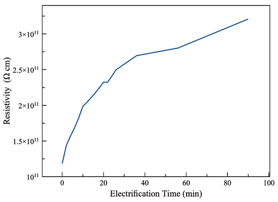 Our data show the rate at which the current is decreasing after applying the voltage, which is very high for the first 60 s and gradually decreasing afterwards. Figure 3 shows the volume resistivity of Viton with respect to time after applying the electric source (electrification time) under 500 V. There is a 21% increase in resistivity in the first 2 min, which is by far the greatest surge throughout the whole graph. Our finding then supports the necessity of waiting for 2 min before taking the measurements. While this graph reports the data up to 90 min, the resistivity keeps increasing for a much longer time as reported in the literature [53].