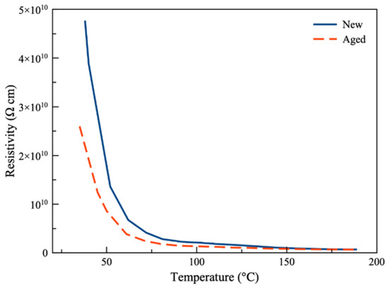 At lower temperatures, the plots representing the resistivity of the new and aged samples are more divergent. However, the separation is constantly decreasing, and the two plots are converging as the temperature is rising. That is, the resistivity of the new sample is decreasing at a higher rate compared to the aged sample. At around 35 °C, the resistivity of the aged sample is shown to be around 45% lower than the new sample, while this difference becomes 15% at 150 °C. The resistivity readings for both samples are very close after 150 °C. A temperature surge from 35 to 190 °C leads to the resistivity decreasing from 4.77 × 1010 to 6.99 × 108 Ω cm for the new sample and from 2.6 × 1010 to 6.68 × 108 Ω cm for the aged sample.