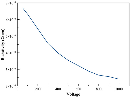 Insulating materials usually behave as non-ohmic materials, which is why the voltage used to measure the resistivity is always necessary to be reported [55]. As mentioned earlier in this article, we followed the recommendation of ASTM and measured the resistivity under a voltage of 500 V. However, it can be beneficial to observe how voltage-sensitive the resistivity is.