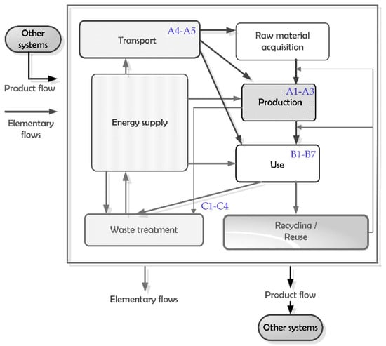 Life cycle assessment (LCA) is a methodology proposed by Bicalho et al. that is used to evaluate the environmental impacts of products from the production of raw materials to the products’ end of life []. According to the scientific works of Jensen et al. [], life cycle analyses flows were initially determined for the depletion of material and energy resources. Life cycle assessment is one of the most common and reliable methods by Klöpffer and Grahl []. Life cycle methodologies can be applied to several aspects of production. To achieve process optimization, life cycle assessment can be successfully used to analyze the environmental impact of different stages of a product’s life cycle [,]. The LCA process begins with the determination of goals and system boundaries. In cases where boundaries are well defined, the following step is life cycle inventory analysis (LCI) and then life cycle impact assessment (LCIA). Finnveden et al. [,,] review the differences in life cycle assessment methods. The variety of developed databases and software programs provide us the opportunity to devise environmental impact reduction solutions at different life cycle stages, as demonstrated by Bach et al. [].