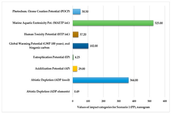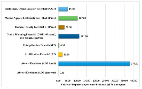 Table 5 and Table 6 illustrate the values of environmental impacts associated with the production life cycle of a 28 kg plastic product for the three examined scenarios. In summary, the values of all the impact categories are greater for Scenario 3. The exception is the value of global warming potential. There are basically minimal differences in the GWP value, but they are slightly higher for Scenario 2.