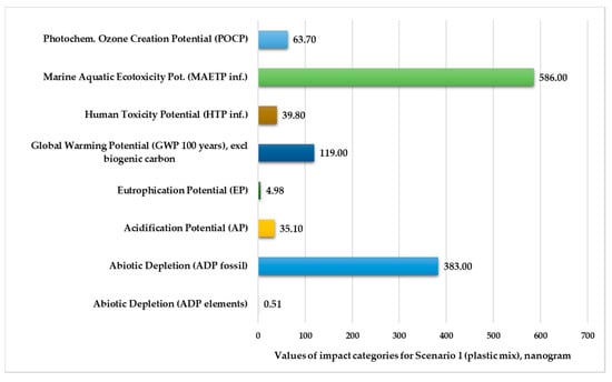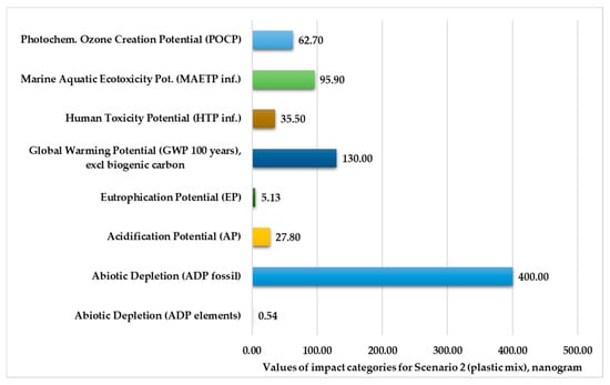 In both examined production processes, except for global warming potential the values of all the impact categories are greater for Scenario 3. In this case, the plastic scrap is traditionally deposited as plastic waste. The global warming potential value is greater for Scenario 2, where the plastic waste is incinerated. For all the examined scenarios except for marine aquatic ecotoxicity, the environmental impacts are greater for the mixed-plastic product.