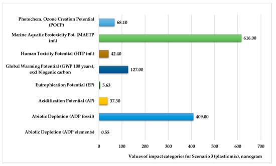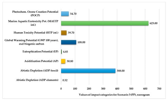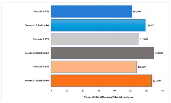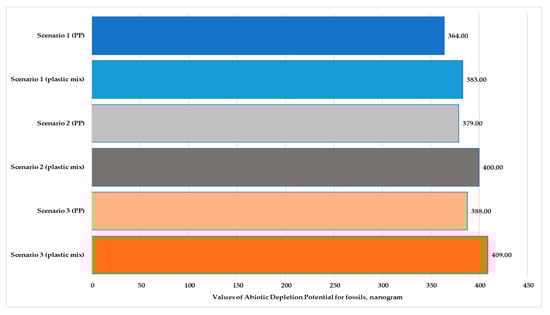However, the value of all the impact categories is higher for the mixed product except for marine aquatic ecotoxicity (MAETP). The value for MAETP is slightly lower for the mixed-plastic product in Scenarios 2 and 3. If ecotoxicity is not assessed, then the highest values are for global warming potential (GWP) and abiotic depletion for fossil fuels (ADPF); these environmental impact categories have been illustrated in nanograms. Figure 8 shows the global warming potential of polypropylene and mixed-plastic products for the three scenarios in the production stage with transport. Figure 9 presents the abiotic depletion for the fossil fuels of both products for each scenario in the production stage with transport. In the case of GWP, we see a difference of 3–4%; in the case of ADPF, there is a difference of 1–1.5% for each scenario.
