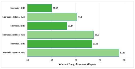 Values of energy resources for polypropylene and mixed-plastic products for the different scenarios (functional unit: 28 kg product).
