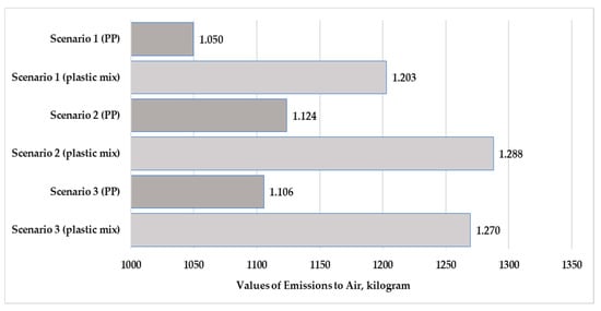 Values of emissions to air for polypropylene and mixed-plastic mix products for the different scenarios (functional unit: 28 kg product).