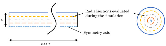 An axis of symmetry is defined over the length of the fibre at and the edge at represents the outer surface of the fibre surrounded by water. The heat transfer between water and fibre is described by the coefficient , where represents the Nusselt number taken from literature [16] and the thermal conductivity of water. The temperature profile inside the fibre is modelled in reference to the equation proposed for melt spinning by Dietz [17], while neglecting crystallisation effects: