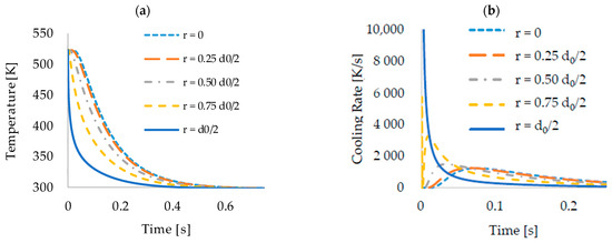 Temperature of the fibre over the time (a) it has spent in the bath and the resulting cooling rates with respect to time (b). The results show the different rates of cooling that arise inside the fibre depending on the radial location.