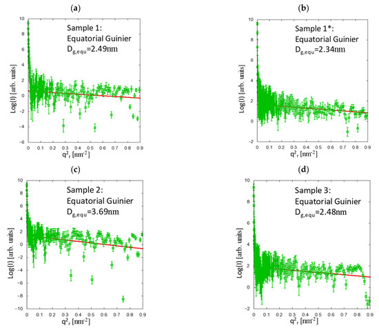 Analysis of the equatorial scattering contributions using the Guinier fit for sample 1 (a), sample 1* (b), sample 2 (c) and sample 3 (d). The results show that the equatorial dimensions appear to be dependent on the spin-draw ratio rather than the draw ratio.