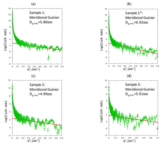 Analysis of the meridional scattering contributions using the Guinier fit for sample 1 (a), sample 1* (b), sample 2 (c) and sample 3 (d). The meridional dimensions depend, as expected, on both the spin-draw ratio and the draw ratio.