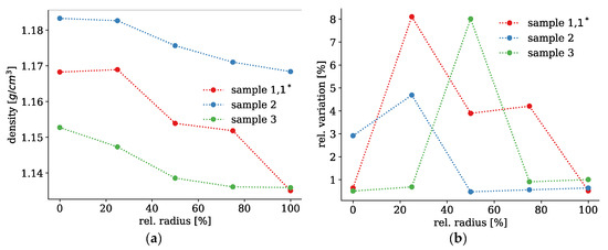 Simulated density profiles over the radius of the investigated samples (a). The densities show a clear decrease towards the outer regions. The relative density variation follows no real trend, but sample 2 shows the most homogeneous density (b).
