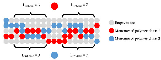 In the numerical evaluation, this alignment was quantified by an interaction length Lint being the total number of directly adjacent monomers of two particular neighbouring polymers that hinder each other’s movement. Thus, the interaction length is always evaluated in pairs of two polymer chains influencing each other by occupying a certain number of adjacent positions and thus reducing the number of possible movements. Figure 8 illustrates the idea of the interaction length in two dimensions.