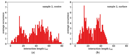 Two exemplary histograms of the interaction lengths in sample 2 at the fibre axis (a) and the surface (b). There is an obviously larger alignment near the fibre axis.