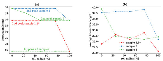 Due to these observations, all histograms of the interaction lengths were analysed with respect to the location of the two maxima and the average interaction lengths. All histograms of the interaction lengths show two maxima, which were examined more closely. The locations of these maxima are plotted in Figure 10a for all three samples and radius positions. The first maximum at shorter interaction lengths is constant for all samples and does also not change over the radius. This seems to be a property of PMMA and independent of the cooling profile. The second peak at longer interaction lengths, however, differs and is strongly influenced by the temperature profile of the cooling process. At the inner regions of all three samples, this second peak occurs at longer interaction length, whereas the two peaks become closer for faster cooling at the surface. The largest difference can be observed for thickest sample 2, the smallest for the thinnest sample 1,1*.