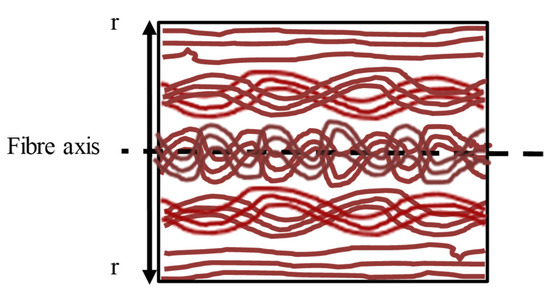 Four PMMA-POFs produced with different sets of process parameters were re-investigated with small-angle X-ray scattering and compared to polymer Monte-Carlo simulations of the cooling. The SAXS intensity distributions were analysed by a Guinier approach in the high-q regions and the distance-distribution functions were computed to extract information on the PMMA fibre nanostructure in the equatorial plane and along the fibre axis. Regions of higher density and polymer–chain interaction could be found in the inner regions of the fibres. Post drawing above glass-transition temperature led to an equalisation of the density profile, whereas the choice of the spinning diameter, winding speed and water temperature had a profound impact on the molecular structure. A larger spin-draw ratio and larger differences of the cooling speeds within the filament resulted in an elevated entanglement in the inner region of the fibre and indicated to different regimes in the inner and outer part of the filament. Numerical investigations by Monte-Carlo simulations confirm the density profile over the fibre radius. Moreover, they also indicate a region of higher chain interaction in the inner region of the fibre with similar transition radii to observations in the SAXS measurements. Measurement and simulation indicate a polymer chain structure within the fibre, as schematically shown in Figure 11. Radial differences in the interaction length of the polymer chains and in the density are both induced by the effect of rapid cooling in the water bath. The numerical simulations indicate, however, that the effects are not directly related to each other and can occur to different degrees depending on the process.