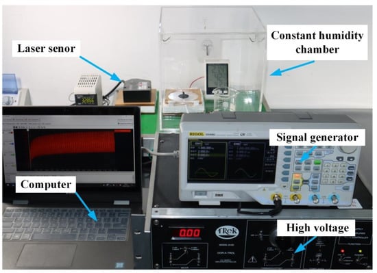 In this article, under room temperature (20 °C), we investigate the humidity effect on the dynamic electromechanical properties of DEs, by applying an AC voltage. The electromechanical testing procedures are illustrated in Figure 1, and the experimental setups are demonstrated in Figure 2. VHB 4905 (3M Company, Sao Paulo, MN, USA) with an original thickness of 0.5 mm is used as the DE material because of its quick response and high deformability. VHB 4905 membrane is, first, equal-biaxially stretched with different pre-stretch ratios. Then we clamp the pre-stretched films by a pair of annular frames to maintain the prescribed pre-stretch ratio. The carbon grease electrodes (no. 846, MG Chemicals, Burlington, ON, Canada) are coated in the center area of both surfaces, forming a circular configuration with a diameter of 30 mm. Each VHB sample is placed in the airtight container for at least 1 h to make sure the VHB 4905 films are fully compatible with the environment. In order to eliminate the errors, five samples are fabricated for each measurement. The various humidity levels can be approximately concerted by different saturated salt solutions, including potassium acetate (CH3COOK), potassium carbonate (K2CO3), sodium bromide (NaBr) and potassium bromide (KBr), which are placed in the airtight container [24]. A high voltage supplier (Model 610D, Trek, New York, NY, USA) is utilized to produce the high voltage for actuation of VHB 4905 elastomer, and voltage signal is generated by a signal generator (DG4062, Rigol, Suzhou, China). A laser sensor (LK-G80, Kenyence, Osaka, Japan) is used to measure the electromechanical displacement of the VHB 4905 film, by attaching a lightweight marker on the edge of the electroactive area. Finally, the experimental data are collected by a DAQ card (USB6003, Ni, Austin, TX, USA) and inputted into the computer to obtain the results.
