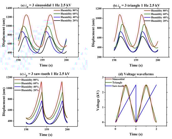 Displacements induced by three voltage waveforms under different humidity levels (20%, 40%, 60% and 80%): (a) sinusoidal signal, (b) triangle signal and (c) saw-tooth signal; (d) three voltage waveforms with a frequency of 1 Hz and peak voltage of 2.5 kV.